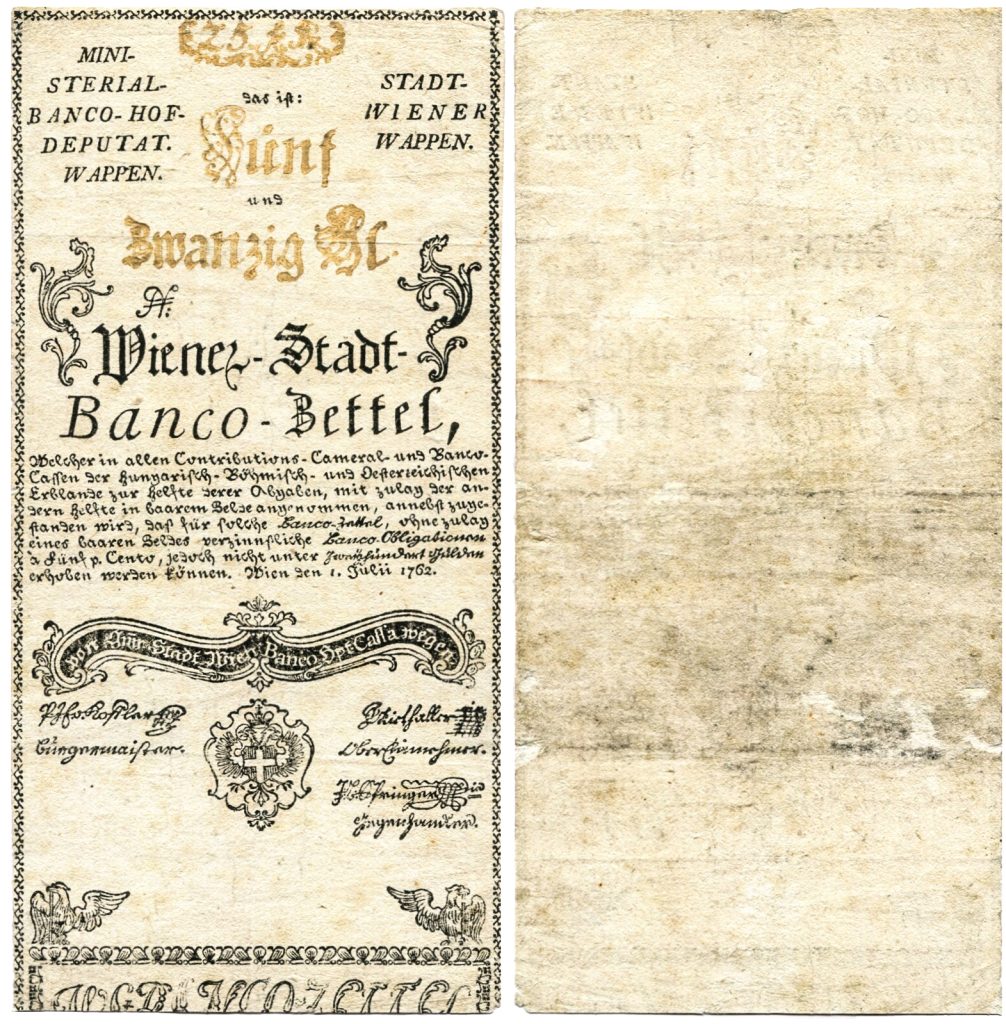 U vreme vladavine Marije Terezije javlja se i prvi papirni novac, tzv. bankoceteli (nem. Bancozettel – bankovne cedulje). Izdala ih je Bečka gradska banka (Wiener Stadt-Banco) 15. juna 1762. godine, u vreme ispražnjene državne blagajne zbog ratova sas Pruskom. Kako nije bilo dovoljno srebra i zlata za kovanje, država je ponudila papir koji je garantovao vrednost. U početku su ljudi bili nepoverljivi, pa je carica primenila lukavu strategiju: porezi su se delom morali da budu plaćani u bankocetelima što je automatski stvorilo potražnju za njima i nateralo trgovce da ih prihvate. Prva serija papirnih novčanica iz 1762. g. imala je apoene od 5, 10, 25, 50 i 100 florina (forinti). Kasnije su se, zbog praktičnosti, pojavili i veći apoeni (čak do 1.000 forinti), ali i manji, kako bi papirni novac ušao u svakodnevnu upotrebu kod običnog naroda. Mada visoke vrednosti, tadašnje novčanice bile su veoma jednostavne, štampane samo sa jedne strane, sa državnim grbom i potpisima zvaničnika banke. Nisu sadržavale portrete vladara kao kasnije novčanice, a akcenat je bio na tekstu koji garantuje isplatu u srebru. U našim krajevima (Bačka, Banat i Srem, kao i Vojna granica), narod je dugo bio skeptičan prema ovim “papirićima”. Verovalo se samo u “zvečeći novac” i tek kada je država počela da kažnjava odbijanje papirnog novca i kada su graničarske plate delom počele da stižu u bankocetelima, papirni novac je postao deo svakodnevice.
