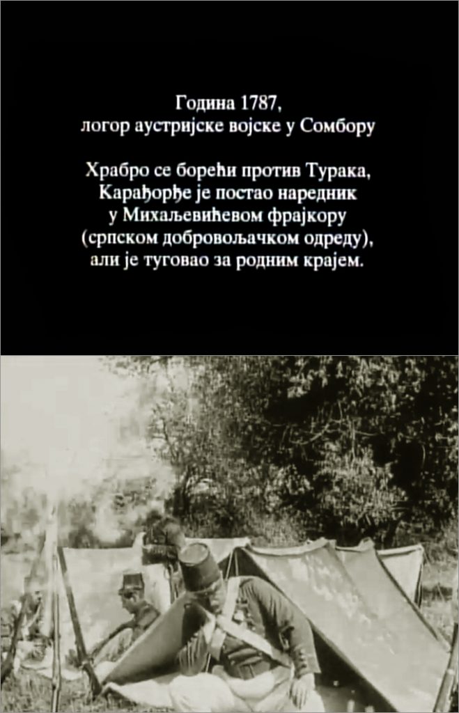 Filmski natpis i scena koja pokazuje Karađorđa u somborskom vojnom logoru