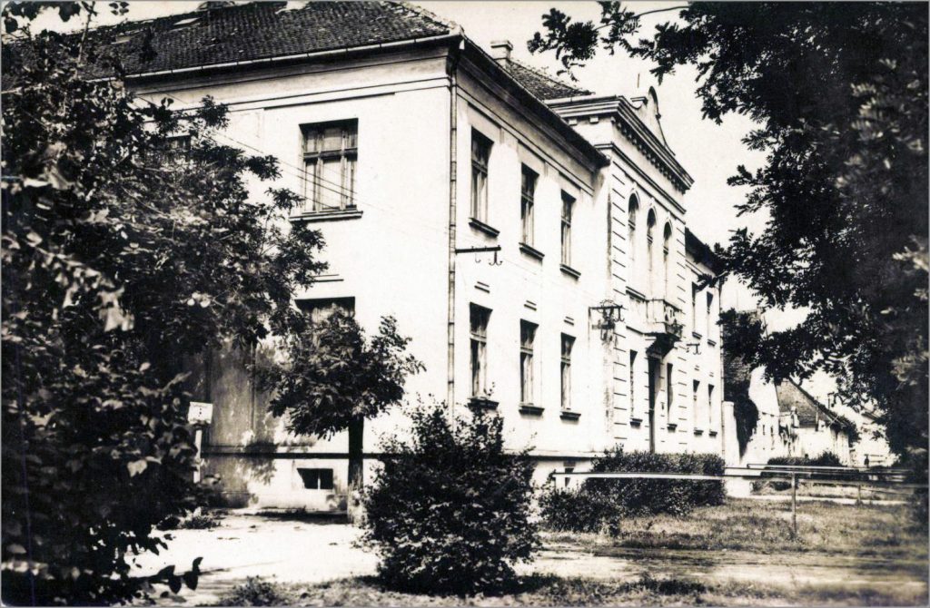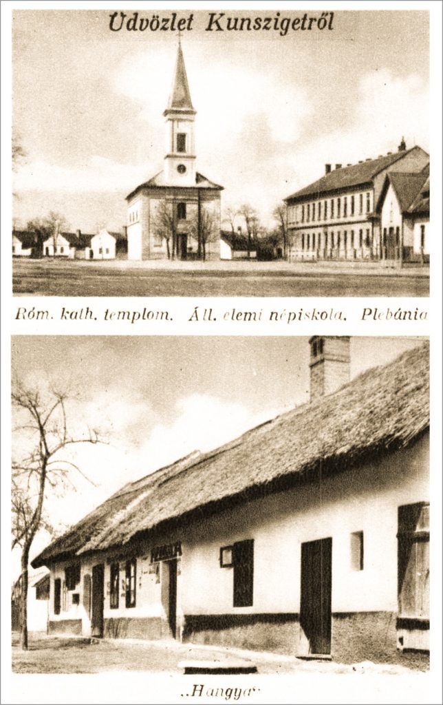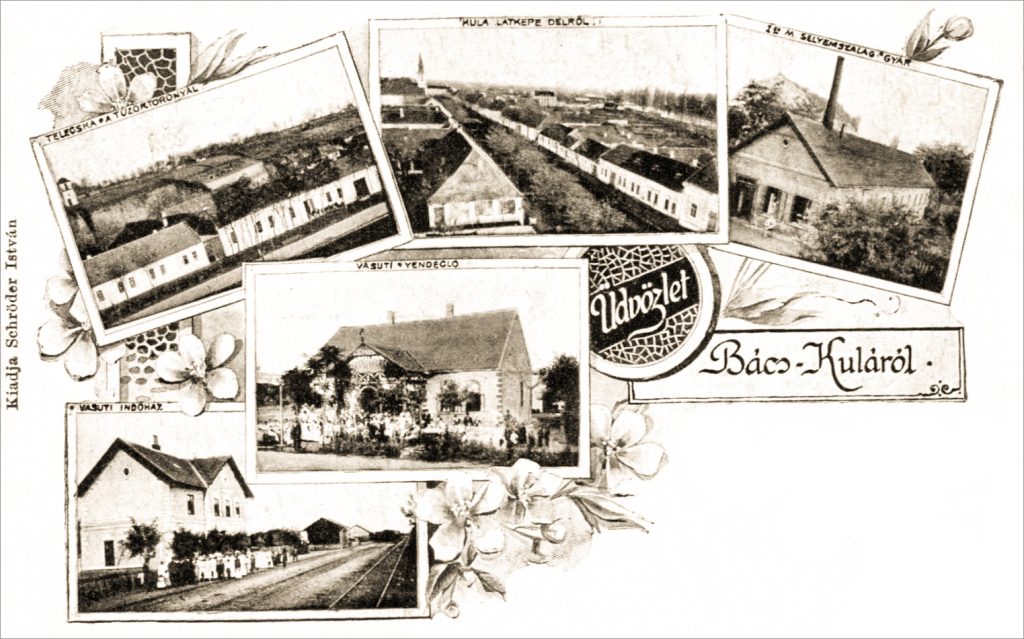 Razglednica Kule s početka 20. veka, sa detaljem katoličke crkve, osnovne škole i župnog doma (plebanije) – gore, i sa fotografijom krčme “Mrav” – dole