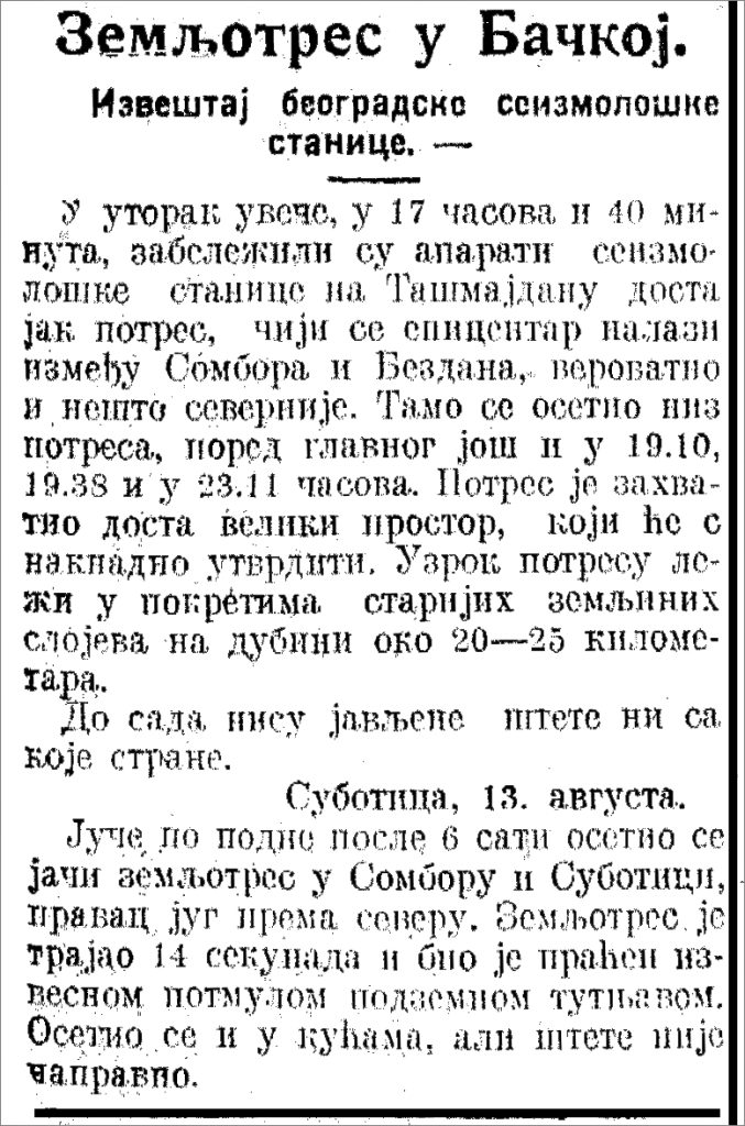 Bilo je i manjih zemljotresa, pa je jedan takav, sa epicentrom u široj okolini Sombora, zabeležen 13. avgusta 1924. godine, o čemu, u kratkom prilogu, 14. avgusta 1924. g. izveštava beogradska “Politika” i kaže da su u utorak, 12. avgusta, u 17:40, aparati seizmološke stanice na Tašmajdanu zabeležili jači potres, čiji se epicentar nalazio između Sombora i Bezdana ili nešto severnije. Usledio je potom i niz manjih potresa u 19:10, 19:38 i 23:11. Materijalne štete nije bilo, a potres se osetio sve do Subotice.